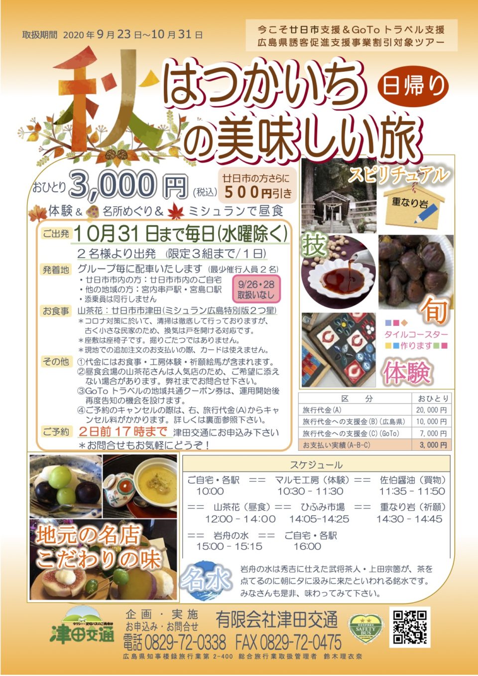 今こそ廿日市支援&GoTo トラベル支援 広島県誘客促進支援事業割引対象ツアー