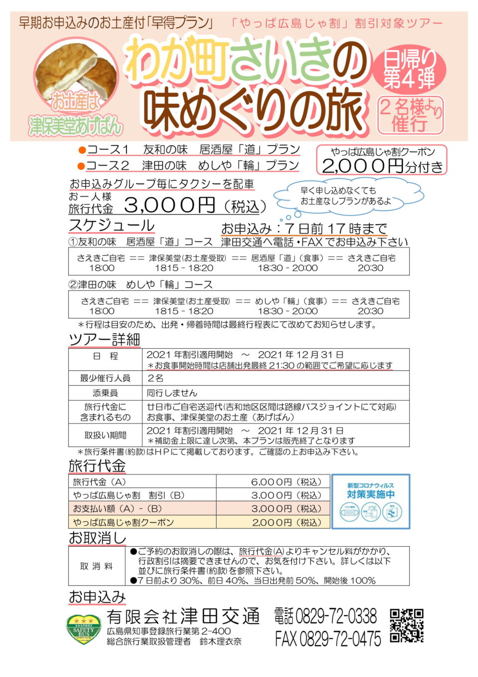 ◆ご出発7日前までの早得プラン! 同じ金額の同一プラン 「わが町さいき味めぐり」の 早期申込み特典付プランです! さいき味めぐりのお土産は 人気の津保美堂のあげぱんですよ!